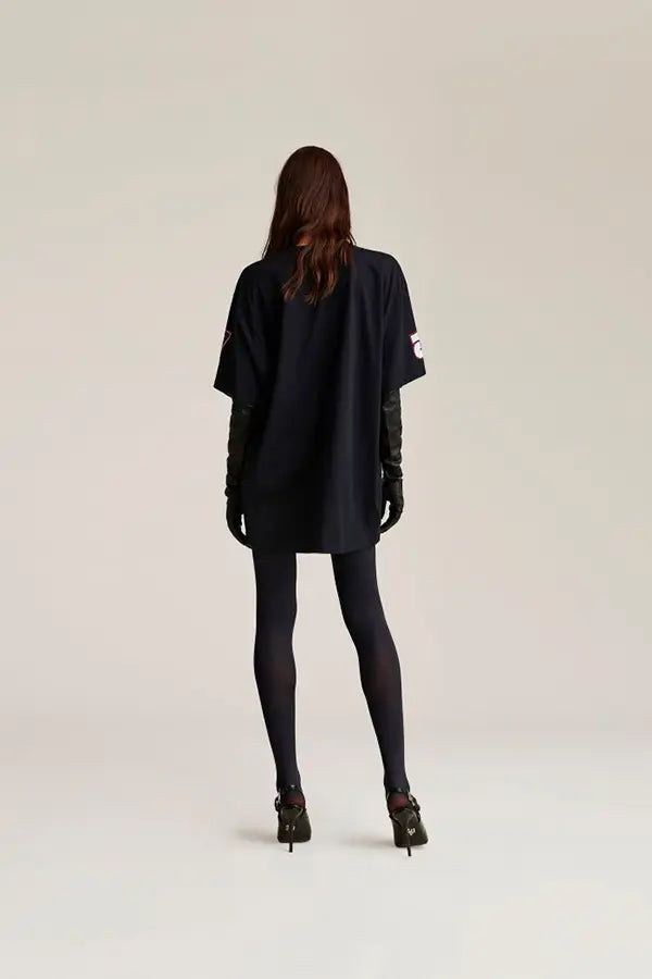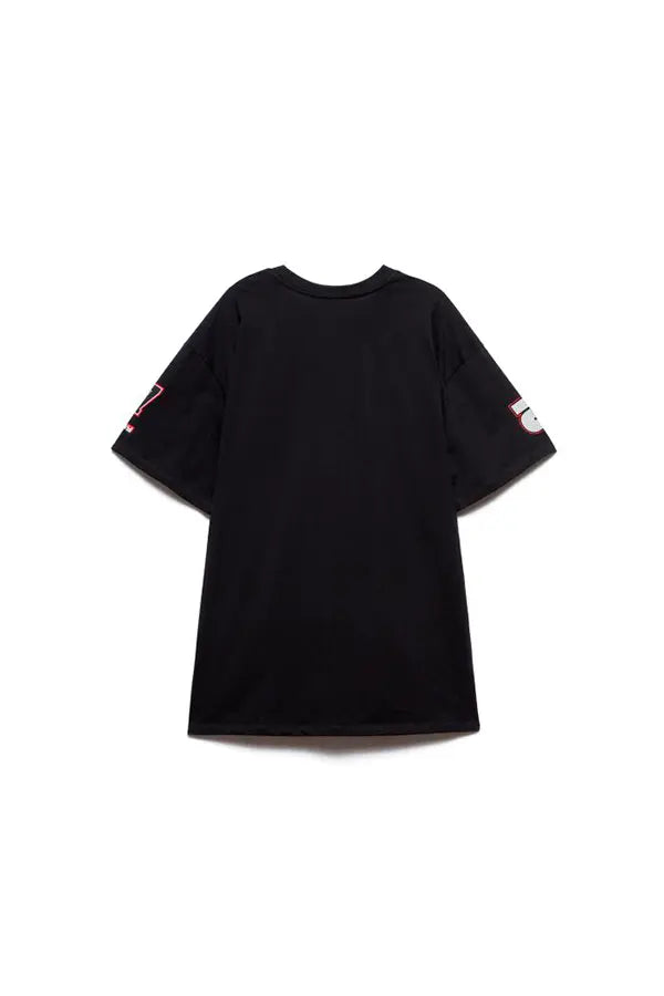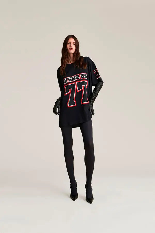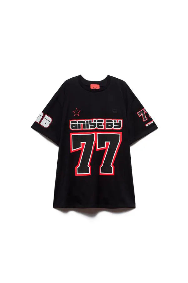 La camiseta 77 Aniye fusiona ropa urbana con ropa deportiva para lograr un look holgado y divertido. El cuello redondo y las mangas cortas mantienen el look limpio y minimalista, mientras que los llamativos estampados en la parte delantera y en las mangas se inspiran en los uniformes deportivos, rediseñados con un toque elegante.