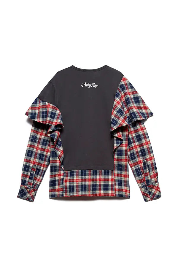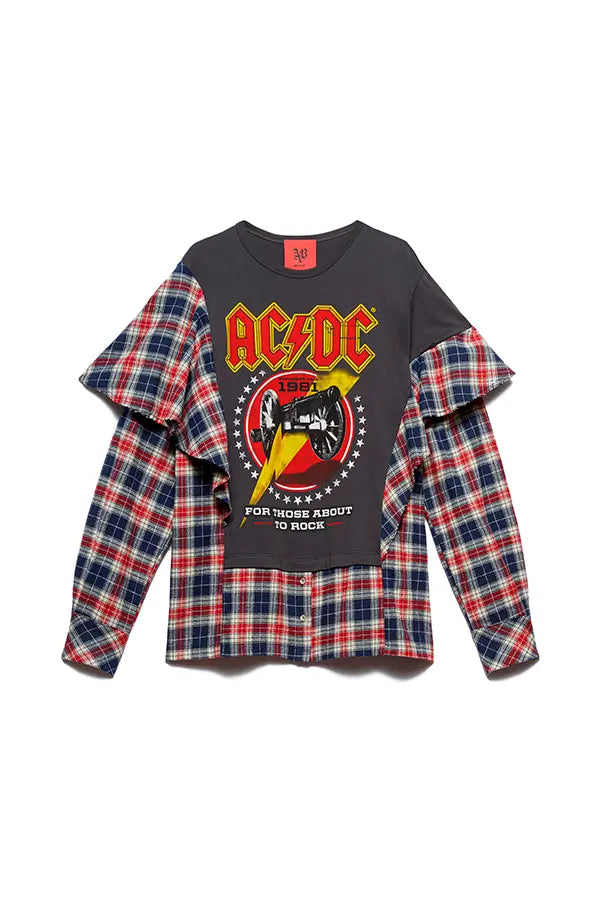 Rock y feminidad, todo a la vez. La camiseta de AC/DC transforma el look clásico en capas en una prenda llamativa y poco convencional. La parte delantera presenta un llamativo estampado de bandas con efecto camiseta, cosido sobre una base de camisa con estampado de cuadros, mangas largas y volantes aplicados. Está rematada con el toque característico de las letras Aniye By en la parte trasera.