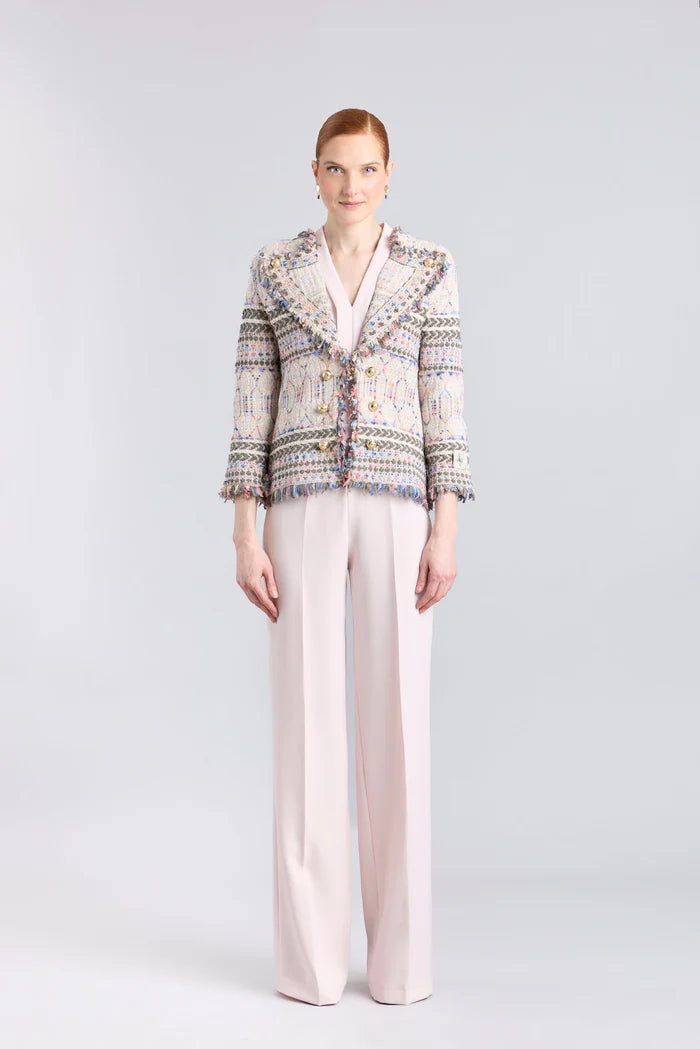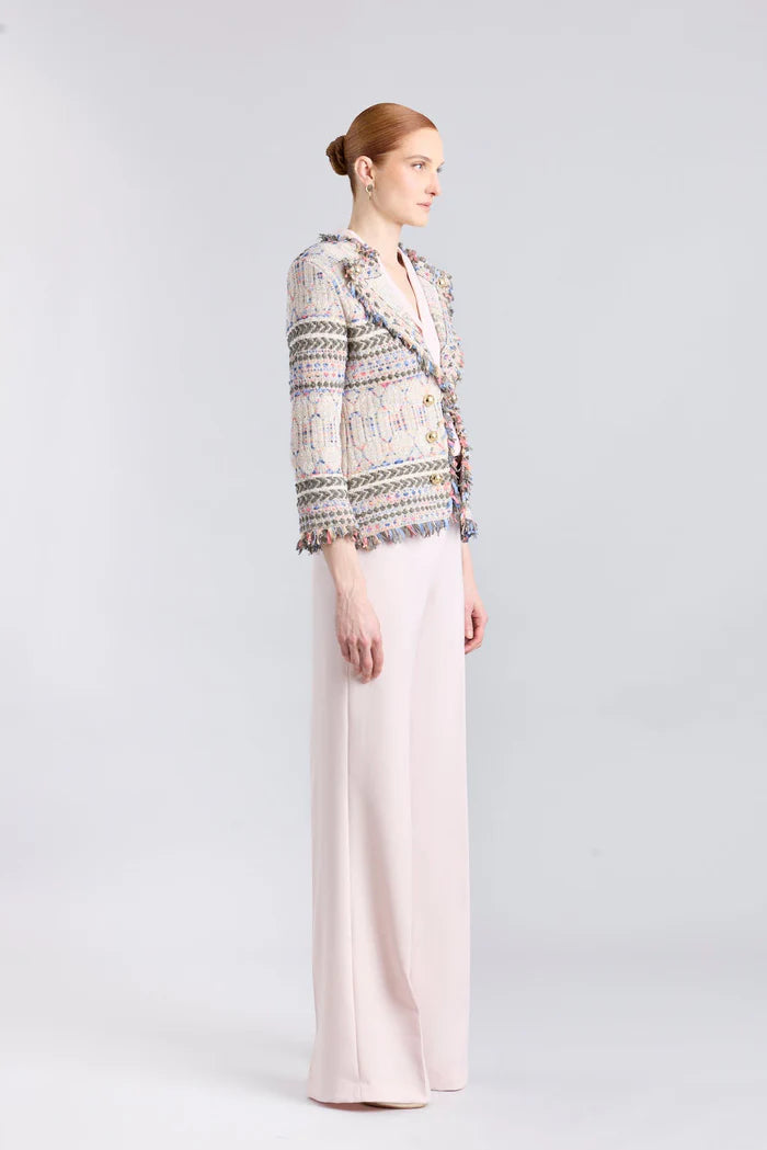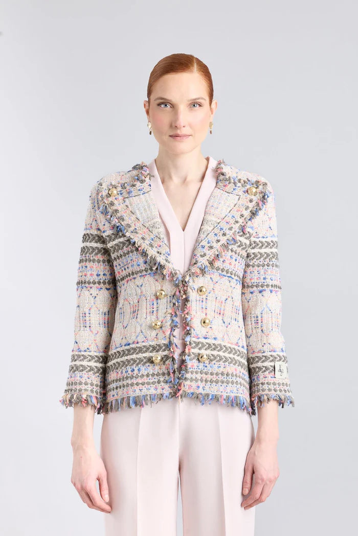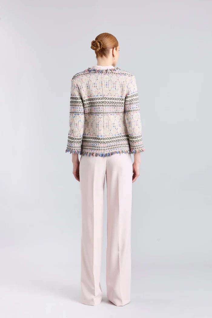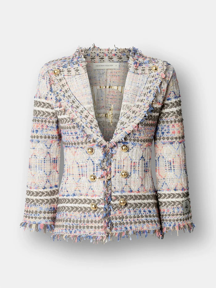 La chaqueta de punto joya Alessia redefine el concepto de punto contemporáneo a través de una explosión de texturas y matices. Este diseño se distingue por una trama rica y compleja que entrelaza tonalidades neutras con destellos vibrantes, creando un efecto visual dinámico y sofisticado. Su silueta, rematada con acabados deshilachados en los vivos, proyecta una imagen de lujo relajado, ideal para quienes buscan una prenda con identidad propia que eleve cualquier conjunto con una elegancia sin esfuerzo.
