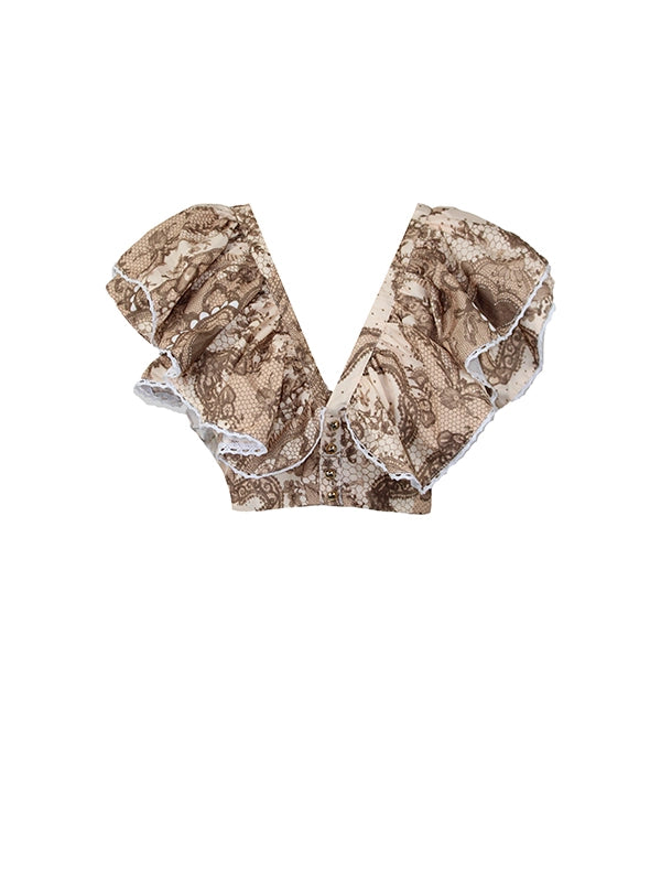 - Top tipo crop, con manga con dos volantes en cascada y atado a la espalda con lazada.
