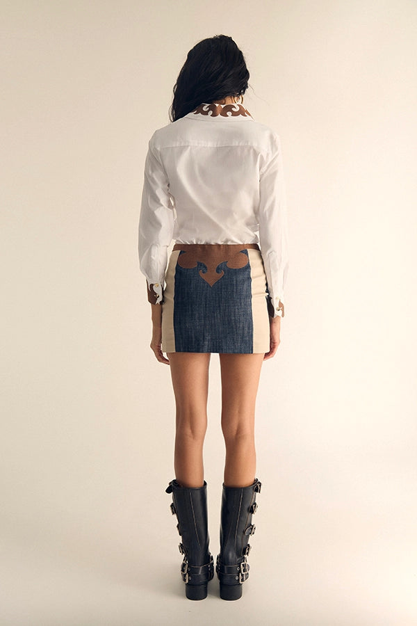 - Mini falda en un tejido denim azul, con en tejido beige en la espalda haciendo contraste.