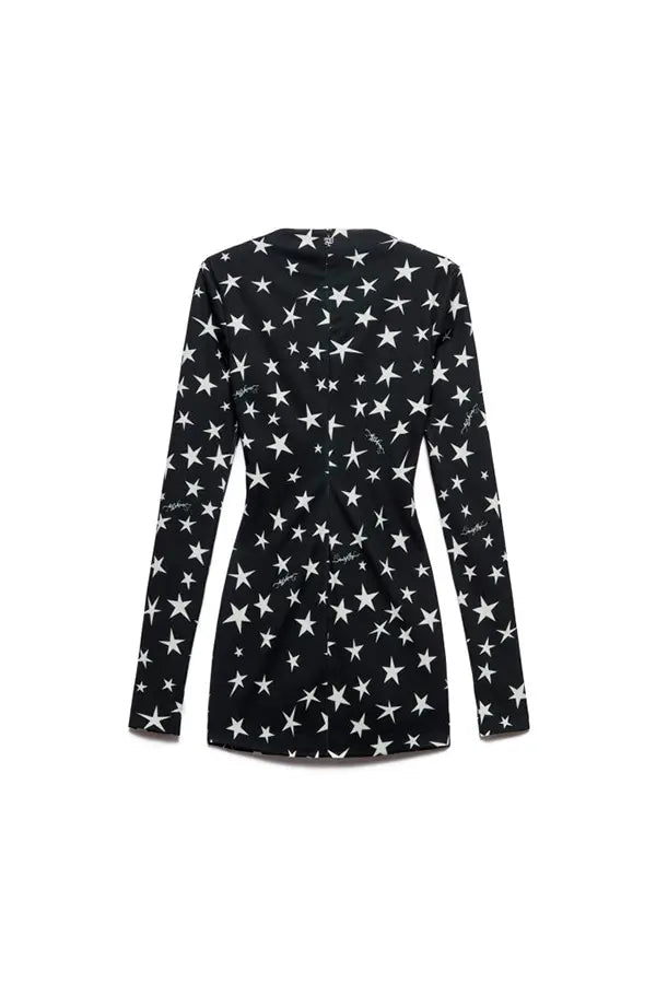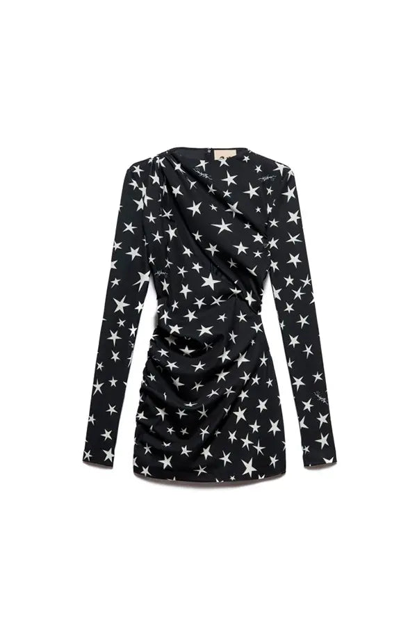 Este es el vestido en el que lo etéreo se une a lo atrevido. Entra el Suky, el minivestido que se roba el protagonismo. Presenta un estampado integral con estrellas y un estilo de inspiración pop, además de un drapeado estratégico que realza la silueta. El cuello redondo y las mangas largas equilibran sus proporciones.