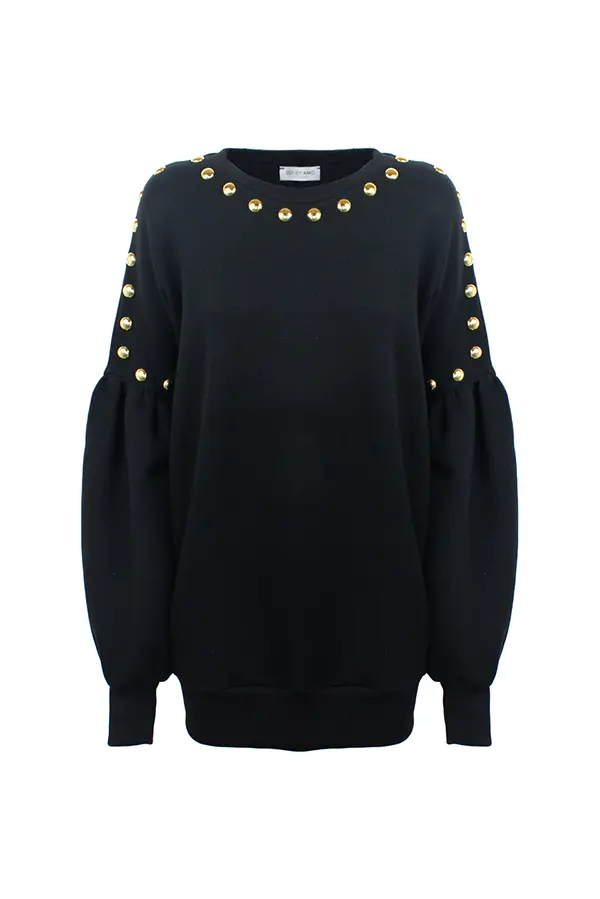 - Detalle de tachuelas doradas en el delantero, bordeando el cuello, hombros y el corte en la manga.