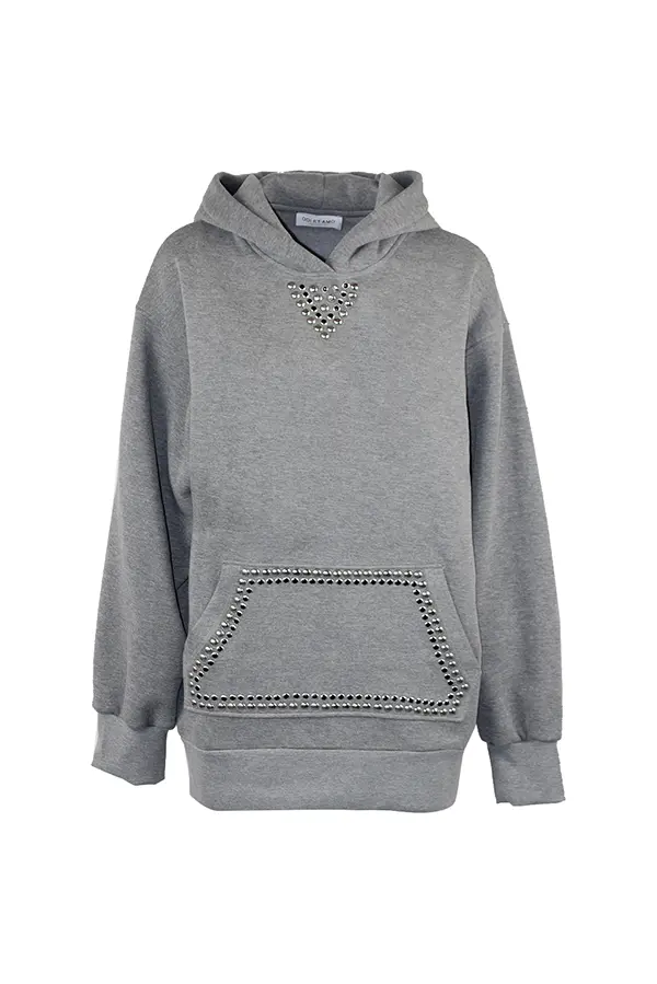 - Detalle en el delantero de bolsillo tipo canguro, silueteado con tachuelas en plata.