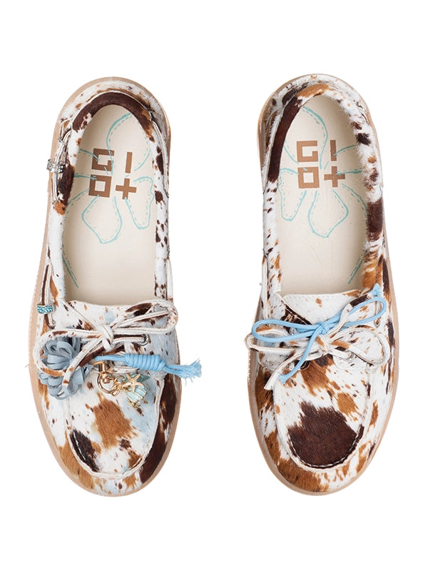 - Mocasín en un estampado de animal print con base cruda y la mancha en tonos camel, marrón y azules. Divinos.