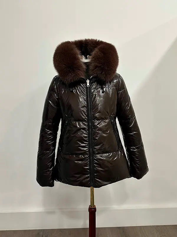 - En un marrón chocolate oscuro acharolado, que no puede ser más divino y en tendencia total. Con bolsillos en los costados con cremallera.