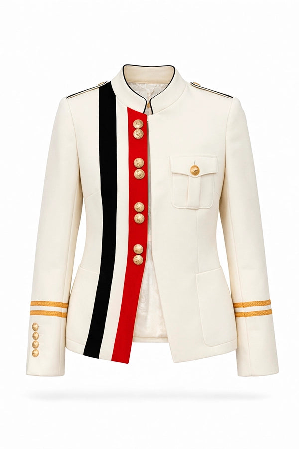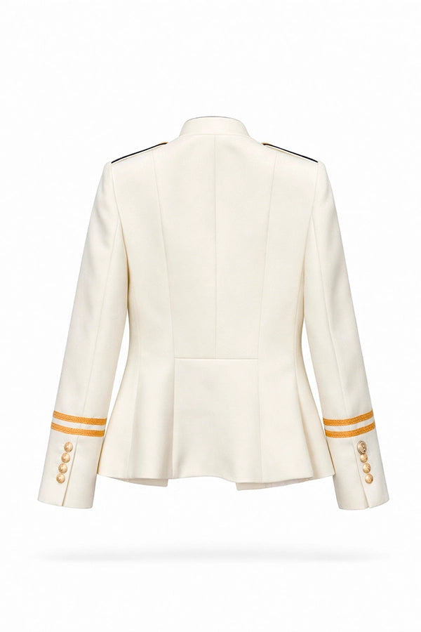 - Las charreteras decorativas en los hombros, adornadas con detalles dorados, refuerzan su inspiración marcial, mientras que los puños lucen dos líneas bordadas en oro que elevan el diseño con un detalle artesanal.