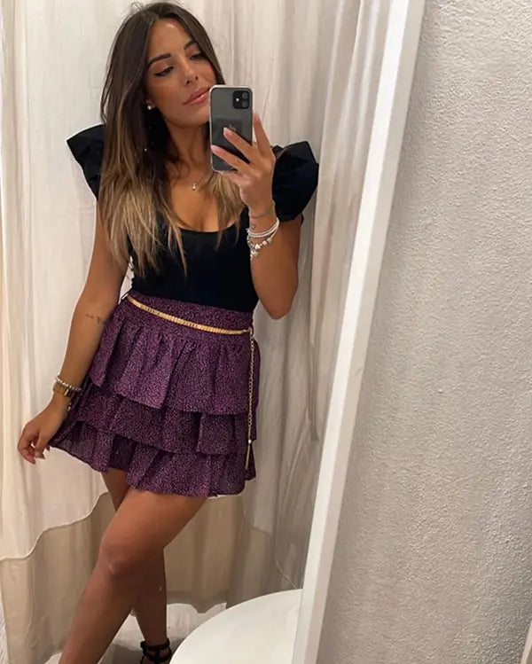 Falda corta morado y con estampado de animal print en verde kaki y negro. Con 3 volantes en cascada y hola fruncida en la cintura. Trabillas y cinturón dorado incorporado.