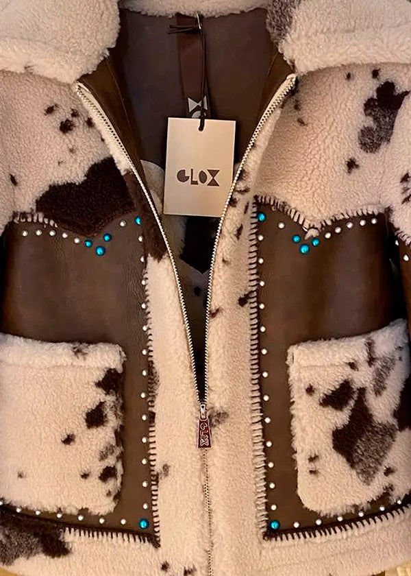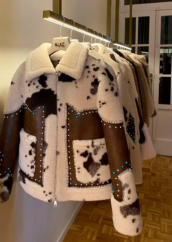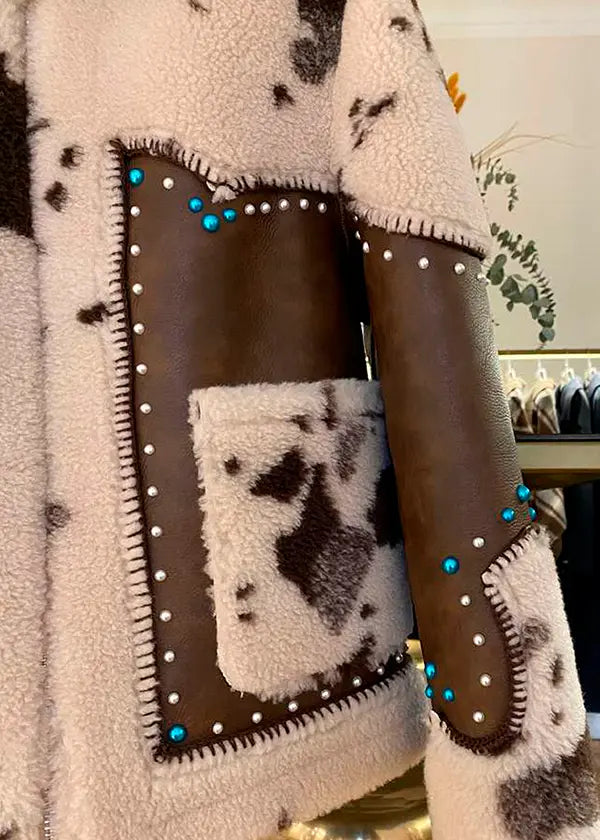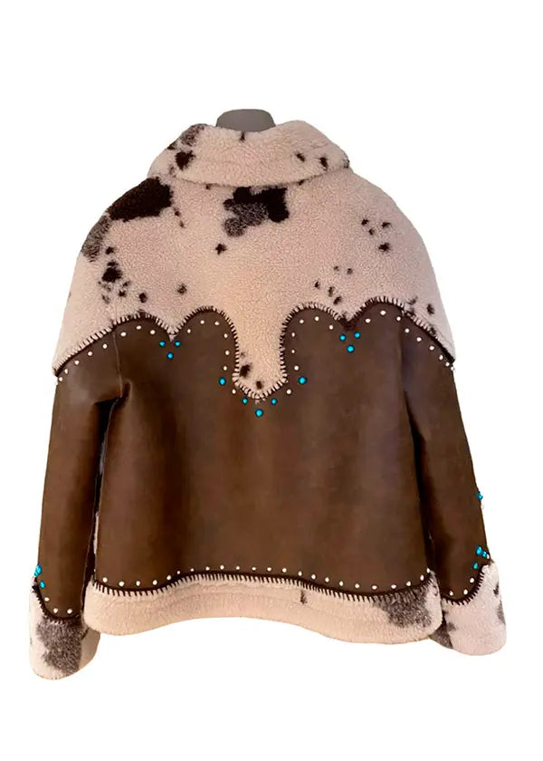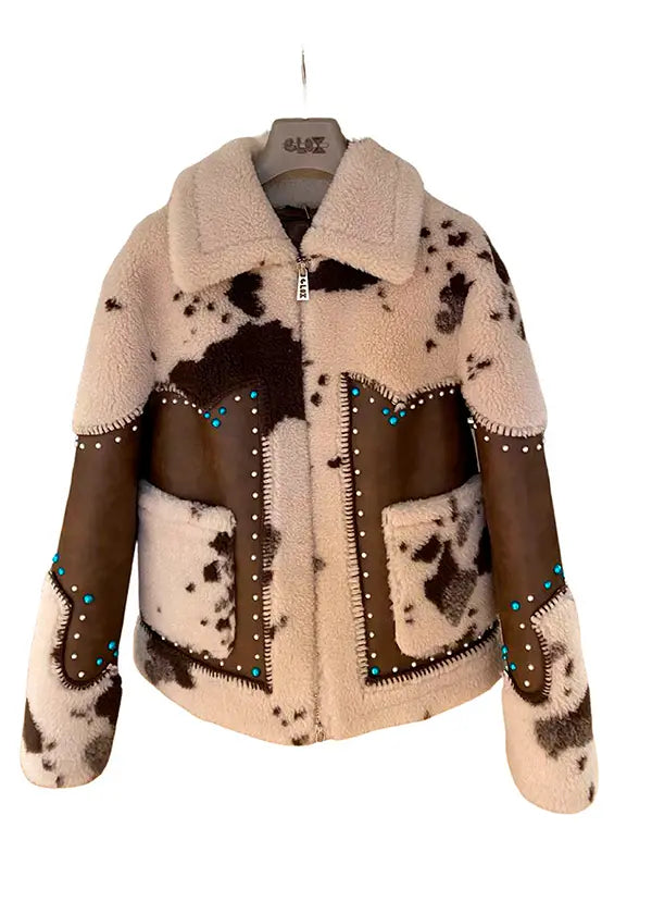 - Chaquetón en ecopiel marrón con mezcla de borreguito en blanco/crudo con mancha de animal print.