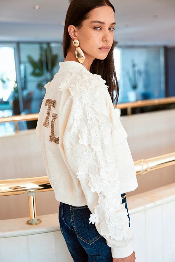 - Detalle de flores de encaje al tono en las mangas.