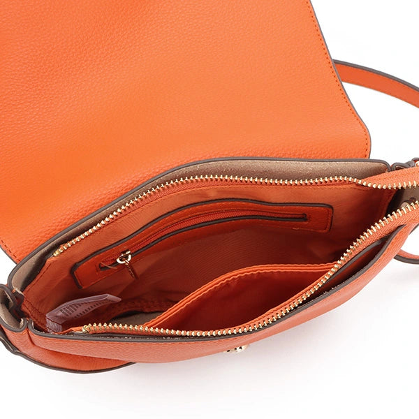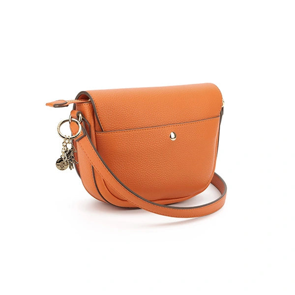 Bolso bandolera de diseño actual y femenino, confeccionado en material efecto piel con acabado texturizado en color naranja. Su silueta semicircular aporta un toque moderno y elegante, ideal para completar looks tanto casual como urbanos.