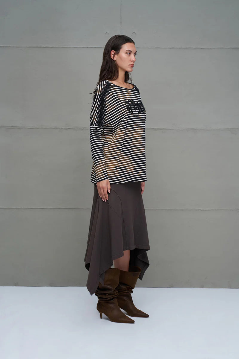 - Detalle de las iniciales de la marca VDR en el delantero con abolorios pedrería en negro. Y detalle en hombros y mangas con abalorios en negro también.