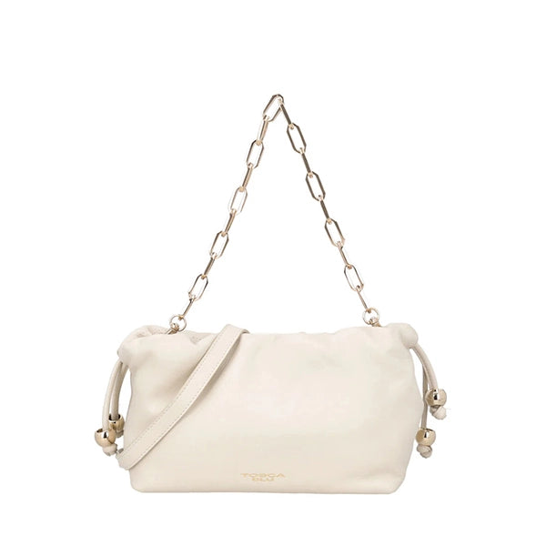 - Su suave piel color marfil está adornada con la placa del logotipo aplicada en la parte delantera.