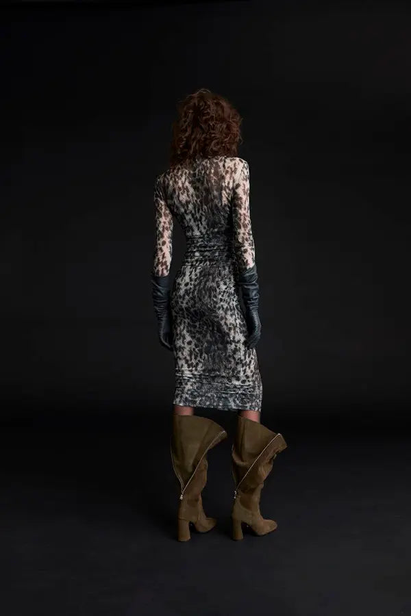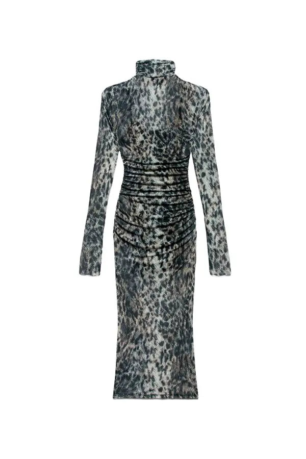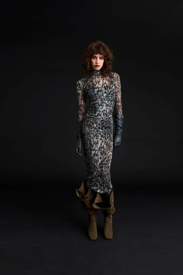 El vestido midi Judy fusiona el poder feroz del estampado animal con un ingenioso drapeado que añade movimiento al diseño y crea un ajuste cómodo y firme. El cuello alto y las mangas largas son detalles refinados que suavizan el efecto del estampado integral.