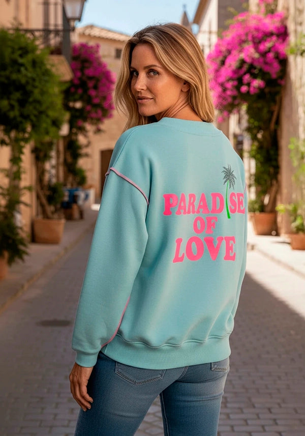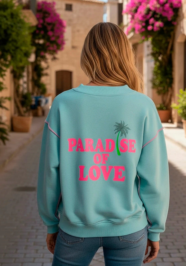 - Y en la espalda en el mismo tono (fucsia) haciendo contraste igual, con el texto PARADISE OF LOVE acompañado de una palmera con strass en azul al tono.