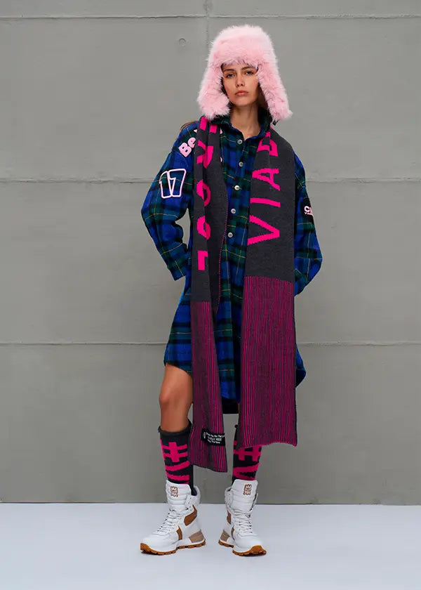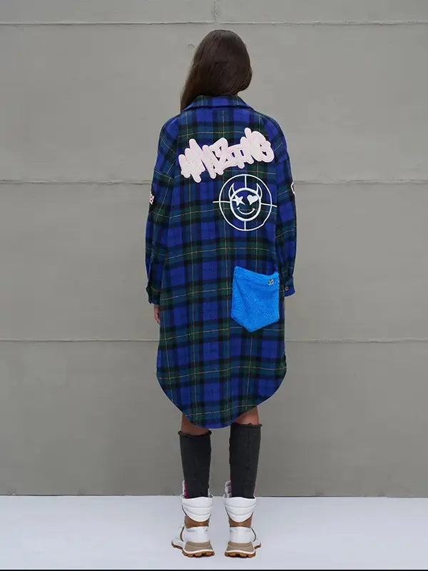 - Vestido/camisa en un estampado de cuadros en gamas de azul y verde.