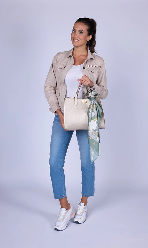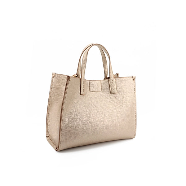 - Bolso tote de piel sintética (muy blandita) con un diseño elegante y moderno. En un color dorado que no puede ser más ideal y fácil de combinar con cualquier look.