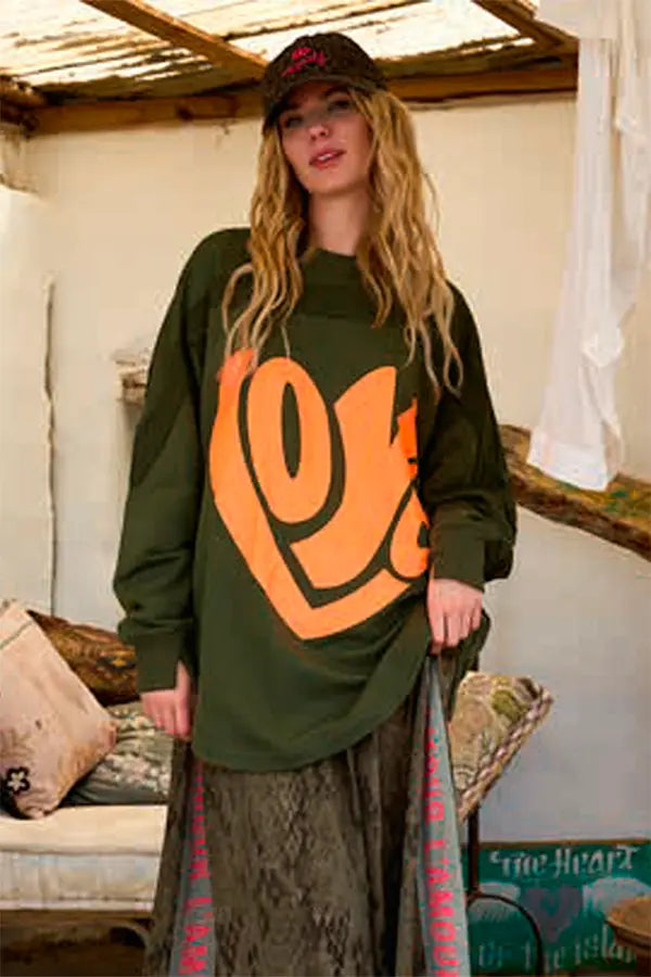 - Con la serigrafia en el delantero con la palabra LOVE con la forma de un corazón haciendo contraste en naranja.