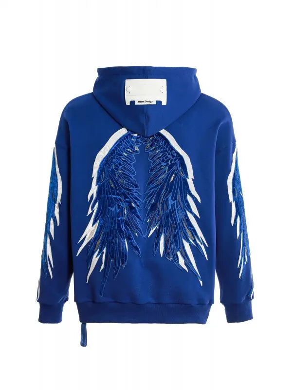- Detalle de alas cosidas en tejido en la espalda y las mangas haciendo contraste en azul y blanco con hilo bordado en dorado.