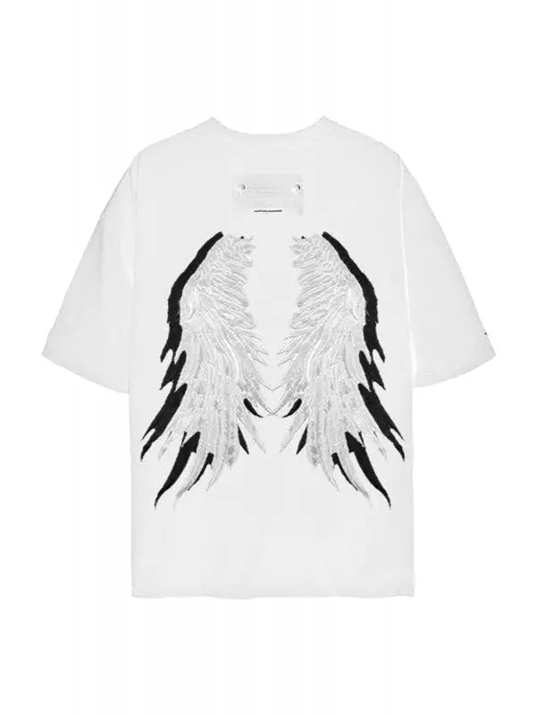 - Detalle de alas en la espalda cosidas en relieve en blanco y negro con bordado en dorado.