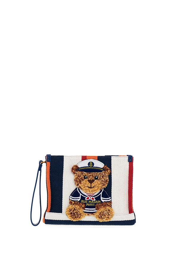 - Clutch compacto y contemporáneo de lona, realzado por una base en contraste y el nuevo bordado con efecto peluche del osito de peluche Sailor Marvin, que le aporta un toque dulce y distintivo.
