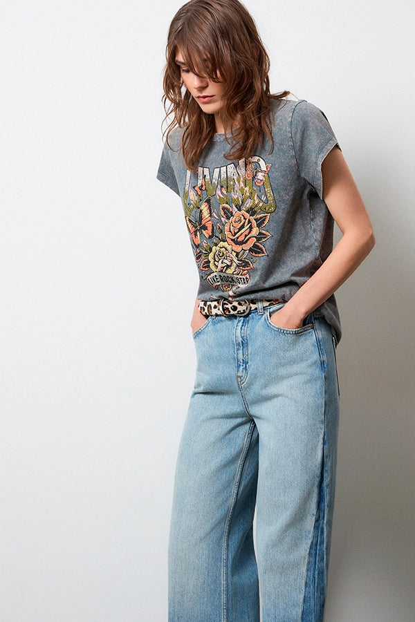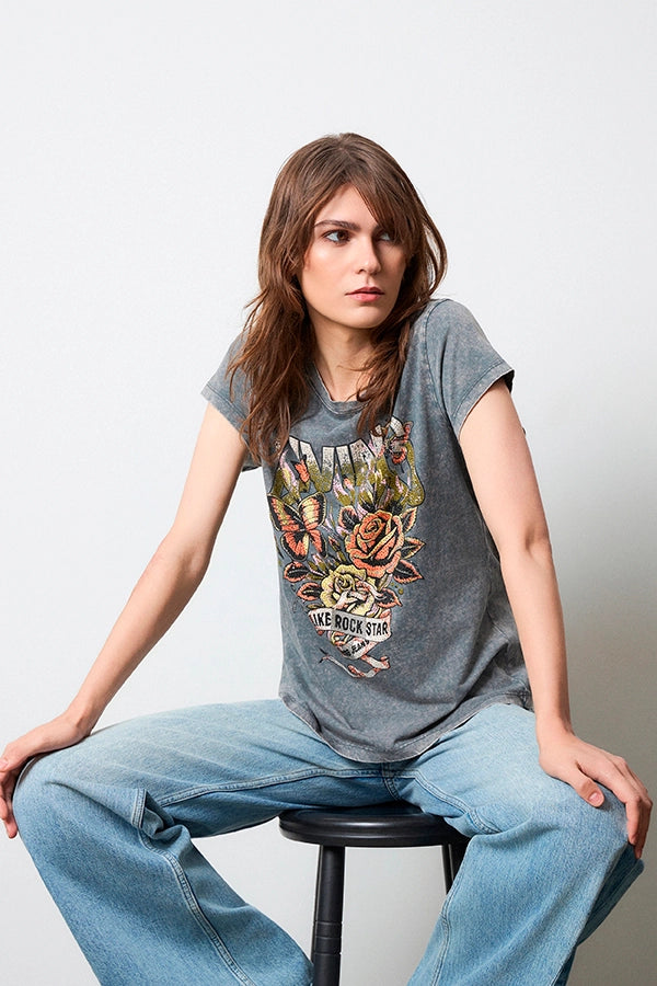 - Camiseta de manga corta en un gris desgastado.