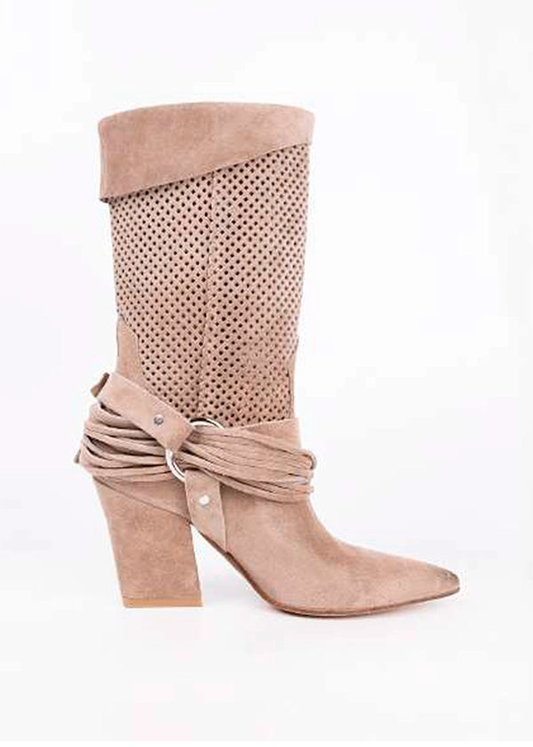Bota de caña media en ante color beige, con diseño troquelado que aporta frescura y estilo.