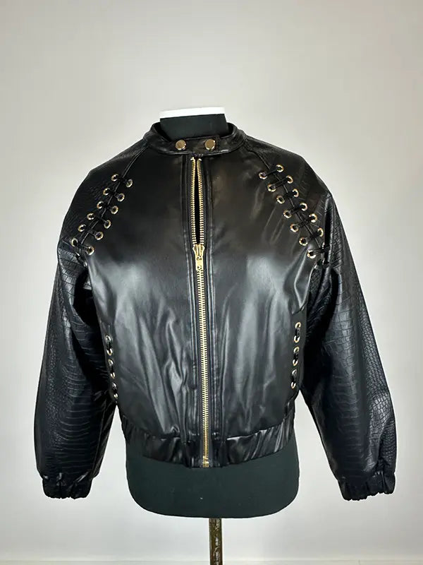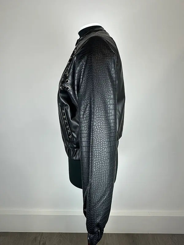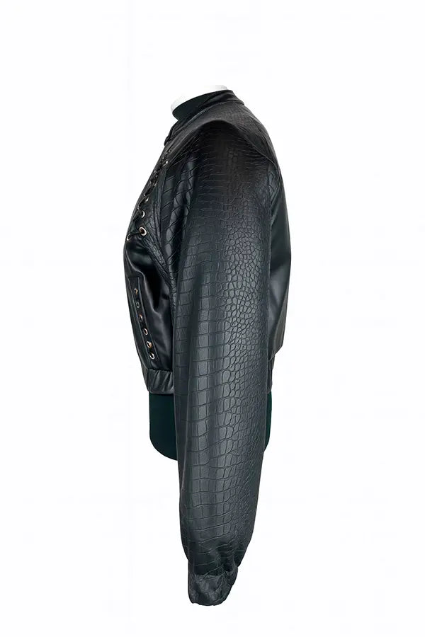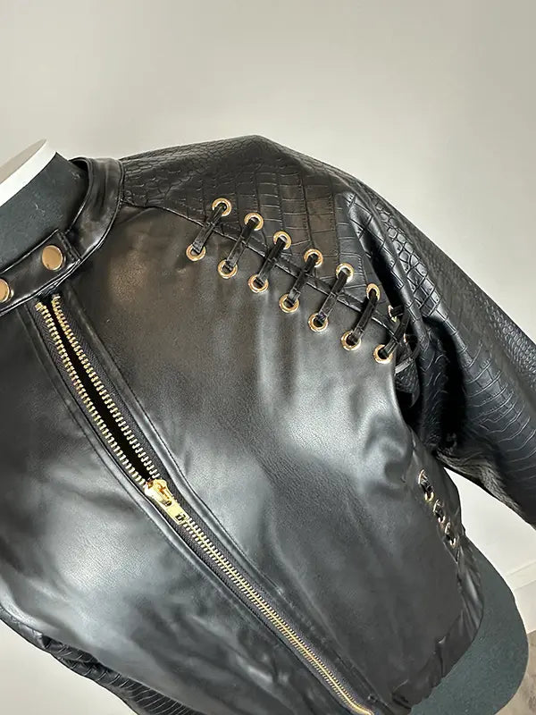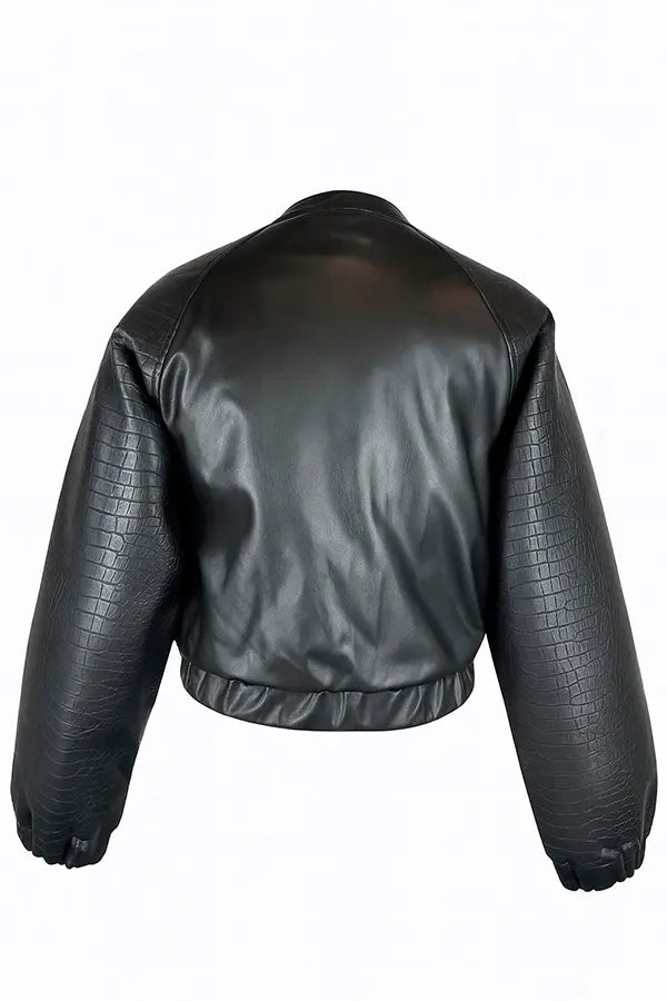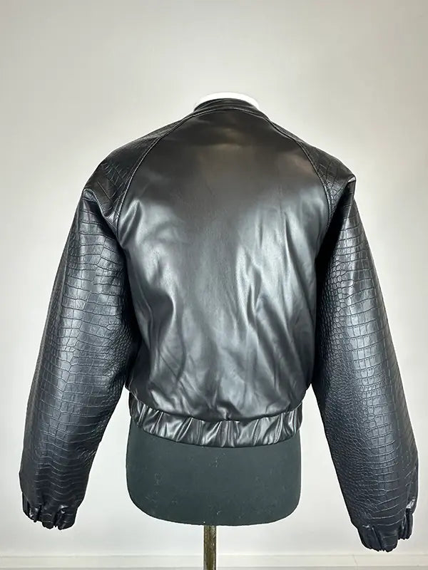 - Detalle de mangas en ecopiel efecto serpiente haciendo contraste con el resto de la prenda, en ecopiel lisa.