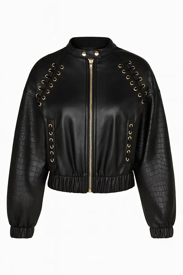 - Cazadora tipo bomber negra en ecopiel.