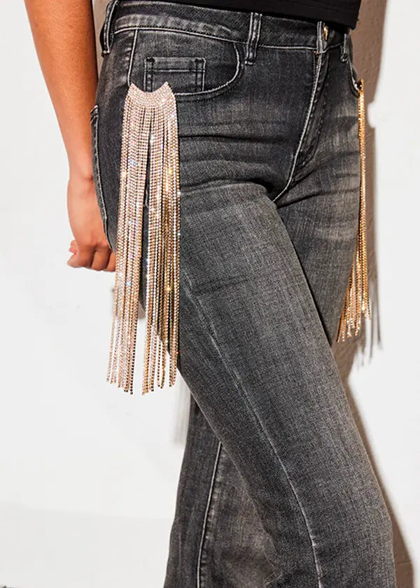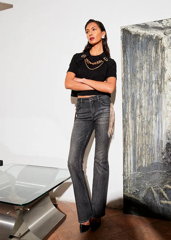 - Pantalón denim en negro lavado y desgastado.