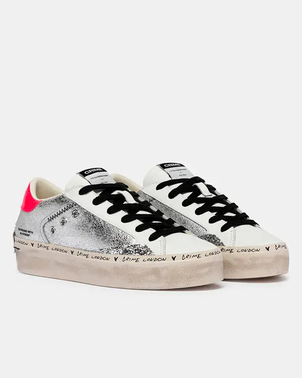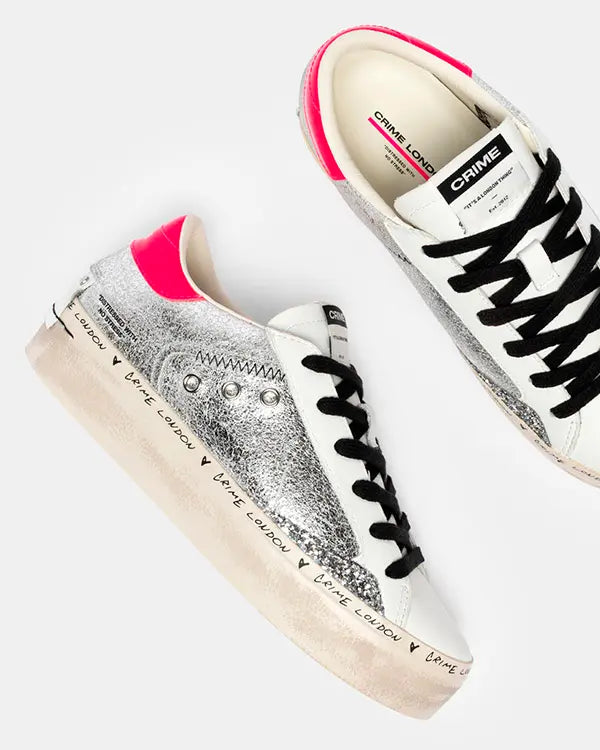 - Parte superior de gamuza plateada con detalles de brillo plateado.