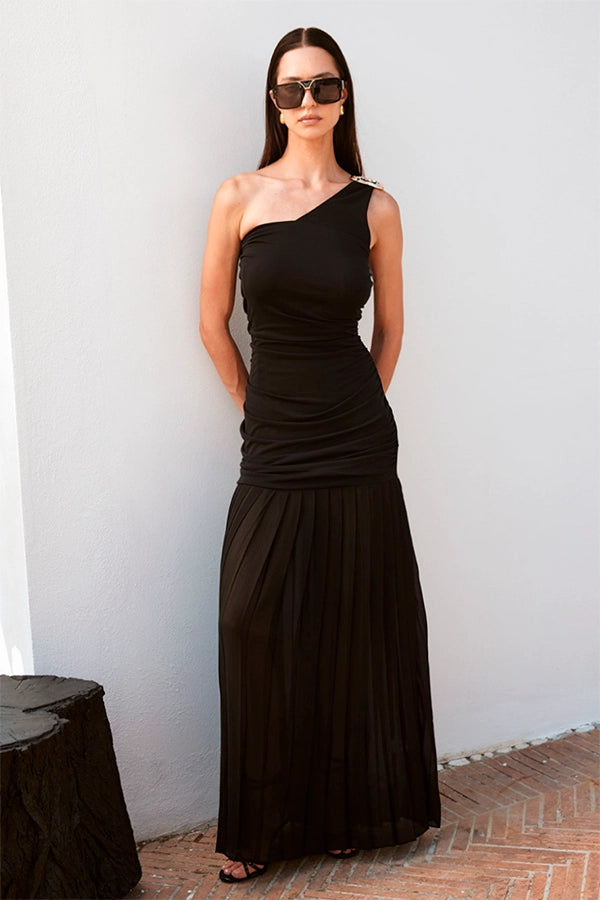 - Vestido negro largo con escote asimétrico.