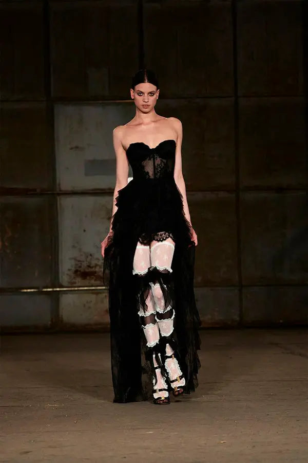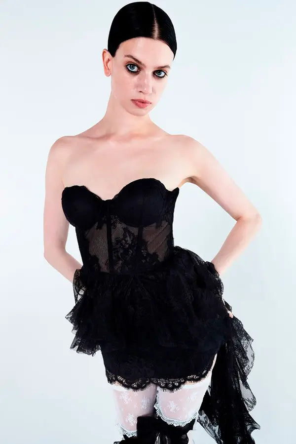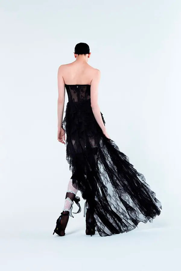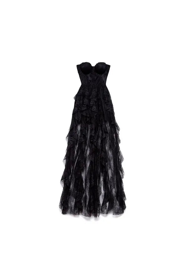 Vestido corpiño largo de encaje con volantes
