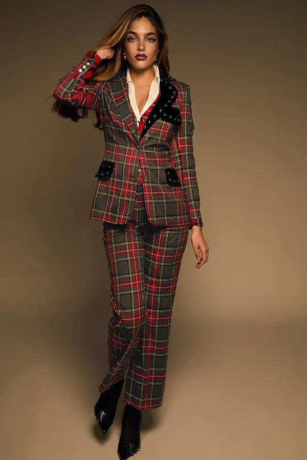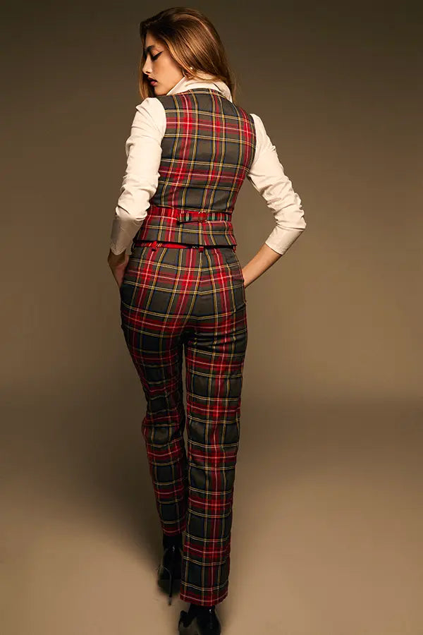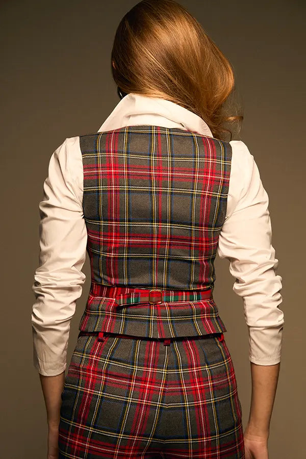 - En un cuadro tartán en gris, con rojo, negro, y trazas de azul, amarillo y verde.