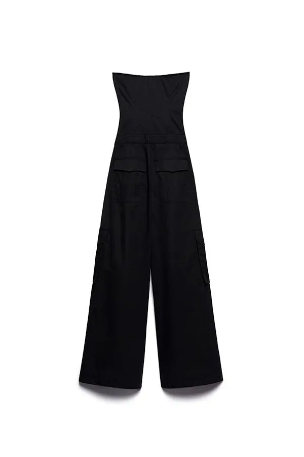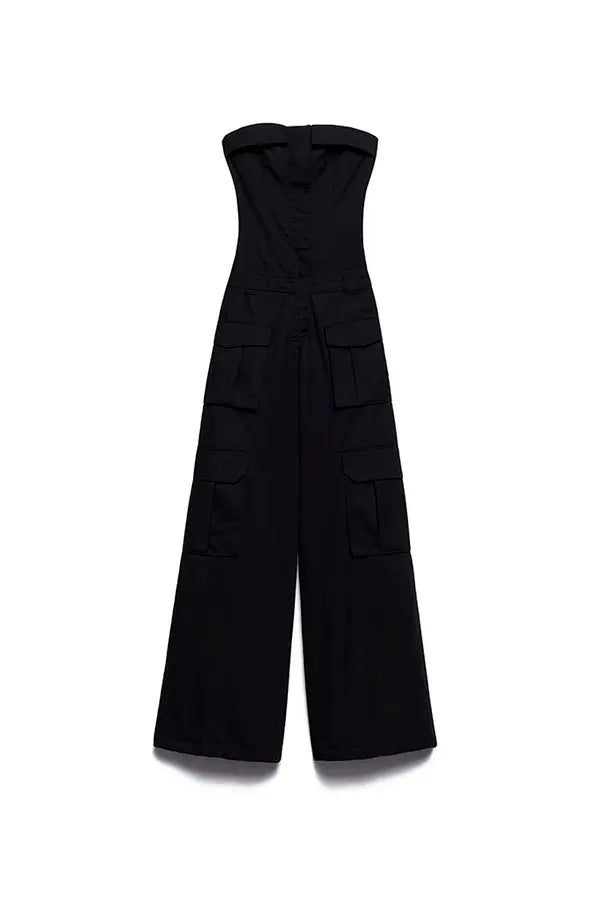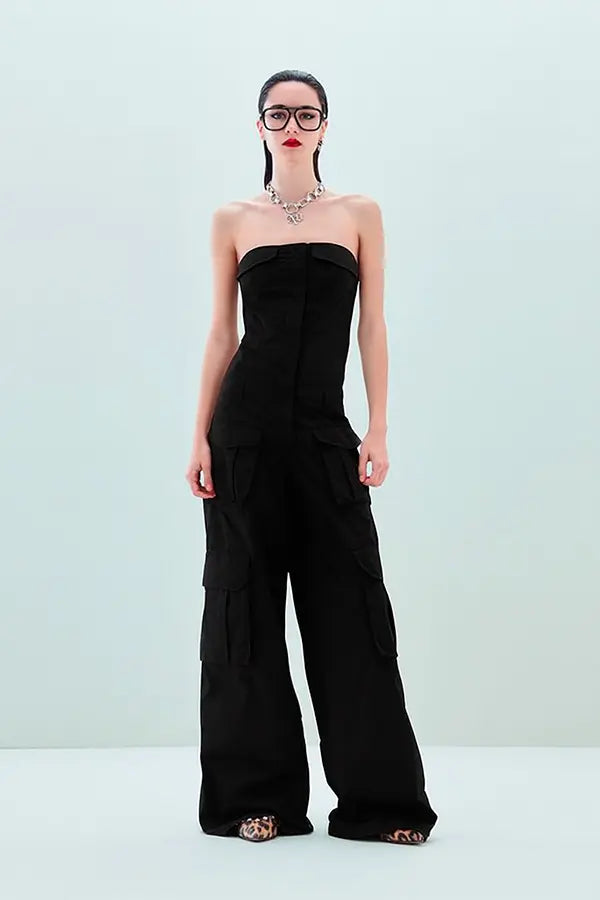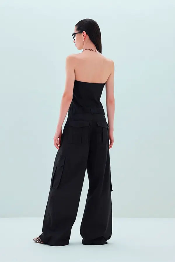 El mono Willow reescribe las reglas del vestir urbano: atrevido, versátil e irresistible. Su corpiño sin tirantes esculpe el cuerpo con líneas estructurales, yuxtapuestas con una amplia pernera palazzo con bolsillos maxi inspirados en la utilidad.