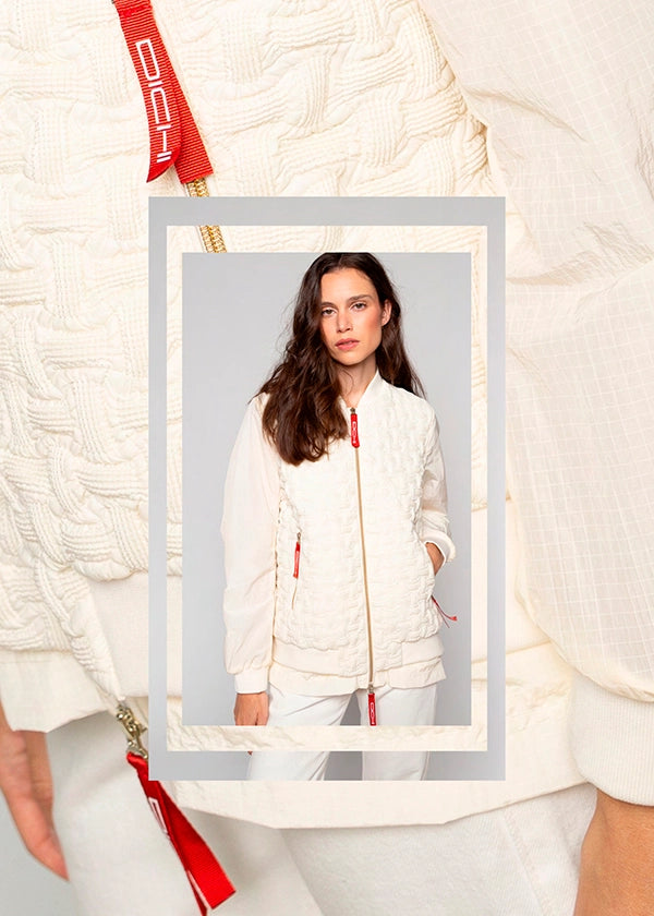 - Cuello, puños y bajo con goma elástica al tono